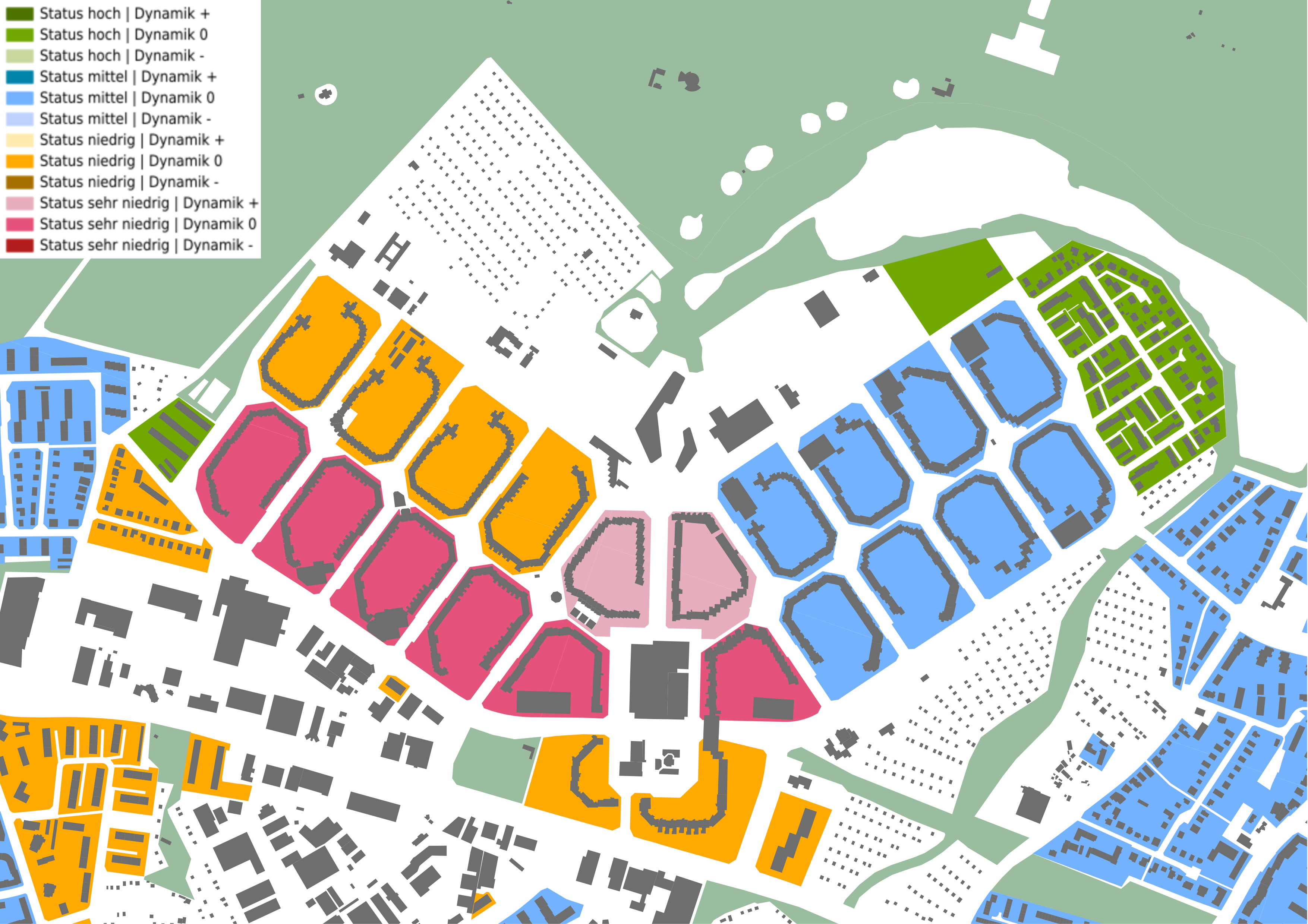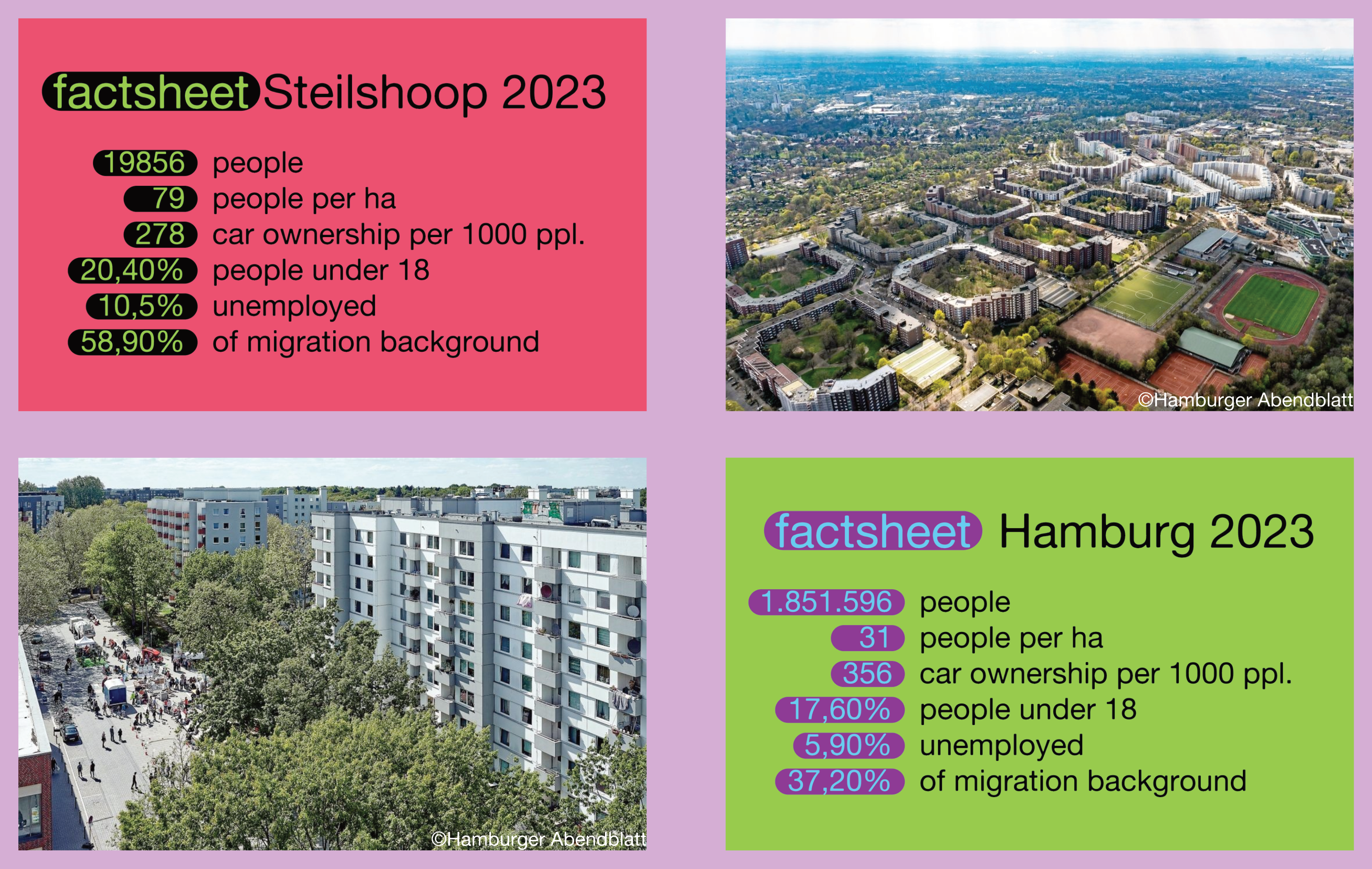 Hamburg's rapid transit system is essentially carried by U-Bahn and S-Bahn, which are oriented toward the central hub Hamburg Hauptbahnhof. In the map, a red 750-meter buffer marks the walking accessibility of U-Bahn stations, while a blue buffer buffer represents the same distance around S-Bahn stations. Areas outside both buffers can be classified as underserved and form initial indicators of Mobility Deserts. Highlighted is the neighborhood of Steilshoop, on which we will focus further in this data story.