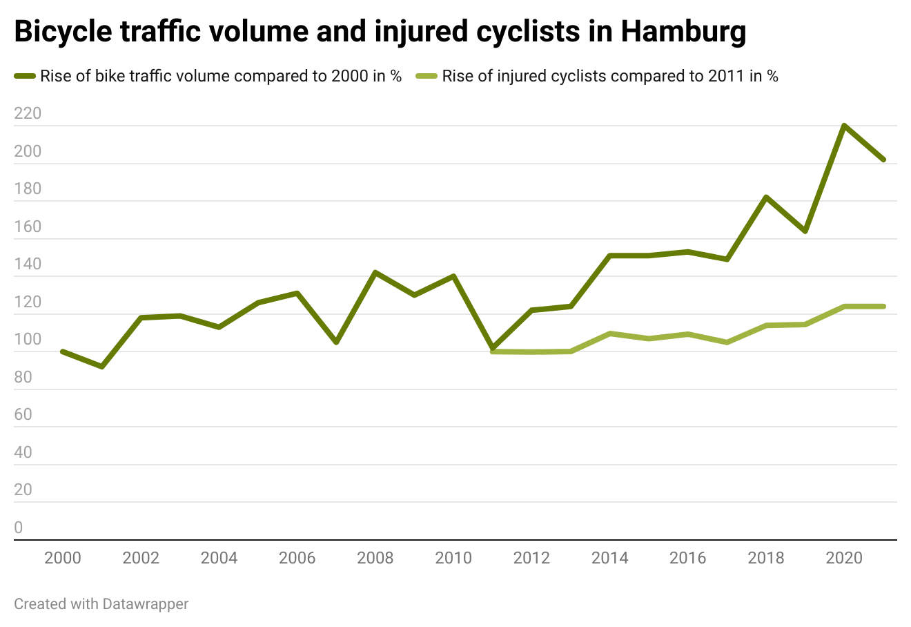 The graph shows that there is an increase in bicycle traffic since 2000. Data collected of injured cyclist since 2011 show that there is no proportional increase between the two graphs, probably thanks to the growing infrastructure for bikes like designated lanes and Fahrradstraßen. However a further improvement of the inner-city bicycle infrastructure could help to actually decrease accidents and make cycling safer and thereby motivating more people to start to discover Hamburg by bike.