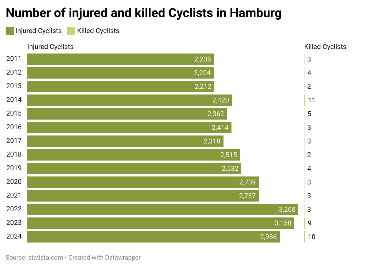 As the data visualization shows the number of cyclist who got killed during an accident increased over the last 14 years. The number of cyclists who got injured in traffic also constantly increased until 2022 but are declining a bit during the last two years. The data show that there is a greater need for action to make cycle paths in Hamburg safer.