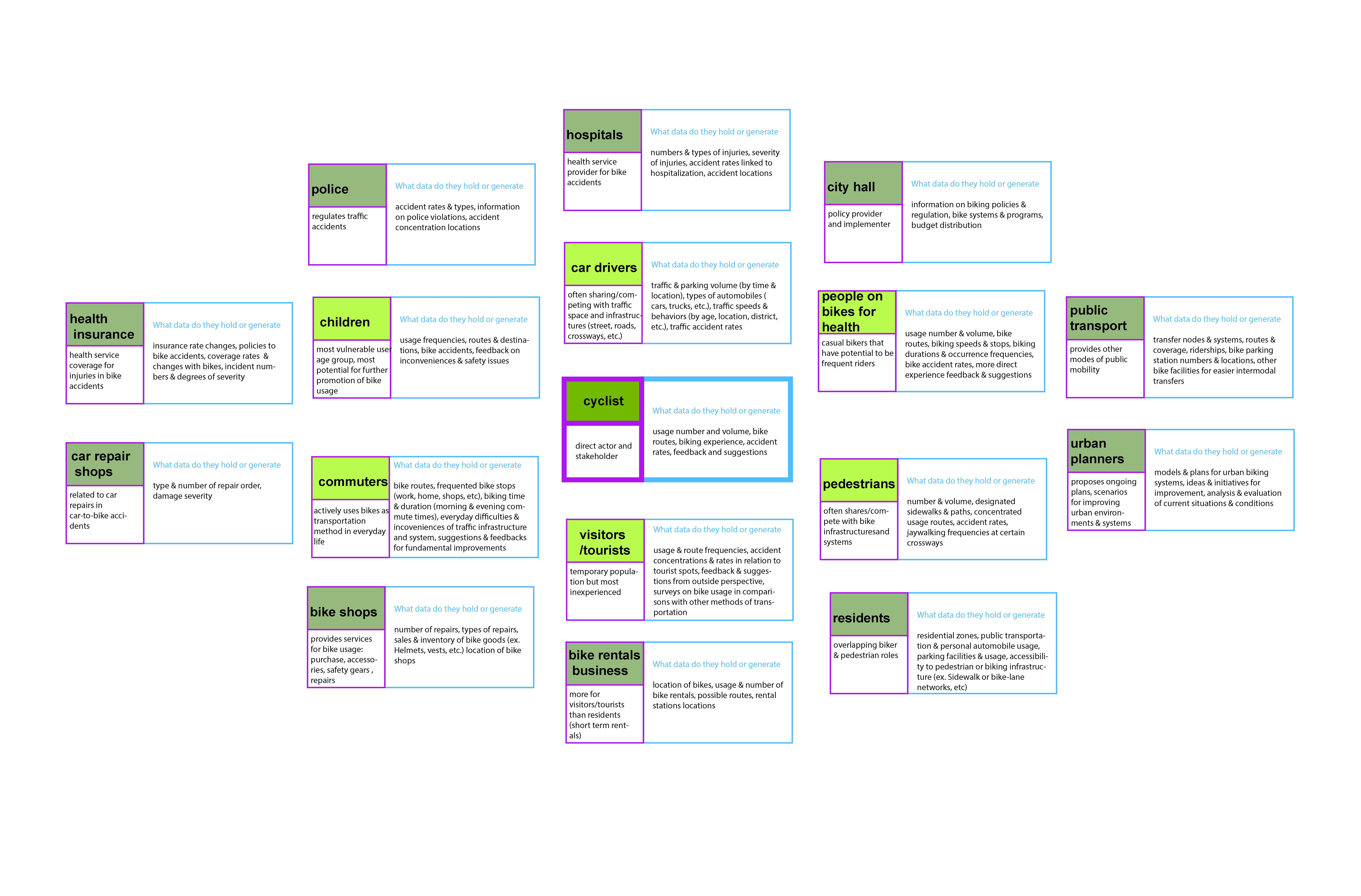The Stakeholder analysis aims to identify key groups and their involvement for the problem statement. The cyclists in the center can be seen as the primary users and therefore build the core stakeholder. Next there are the direct stakeholders, who interact closely with the core group and are affected by the stated problem. The last level are the indirect stakeholders, which are more peripherally involved but still provide relevant data for mobility planning and traffic or accident rates.